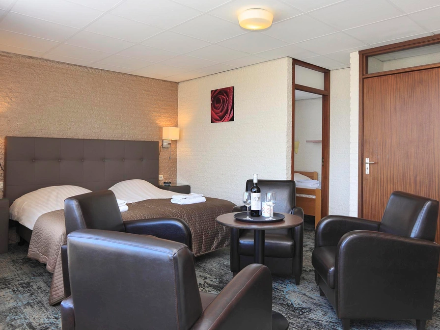 Deze 4-persoonskamer met terras is een heerlijke uitvalsbasis voor gezinnen die willen genieten van rust, ruimte en comfort. De kamer ligt in de rustige tuin van het hotel en bevindt zich op de begane grond – ideaal voor wie gelijkvloers wil verblijven, ook met jonge kinderen. Binnen vindt u alles wat u nodig heeft voor een ontspannen verblijf met het hele gezin. De kamer is ruim opgezet en biedt directe toegang tot een eigen terras, waar u bij mooi weer buiten kunt ontbijten, lezen of een spelletje doen met de kinderen. Na een goede nachtrust begint u de dag met een verzorgd ontbijtbuffet in het restaurant. Daarna verkent u het eiland of blijft u gewoon in de buurt: een drankje op het terras, even bij de open haard, of een diner met het gezin in het à la carte restaurant – het kan allemaal. Klik op "Bekijk hotel Duinzicht" voor meer informatie over het hotel en de voorzieningen.