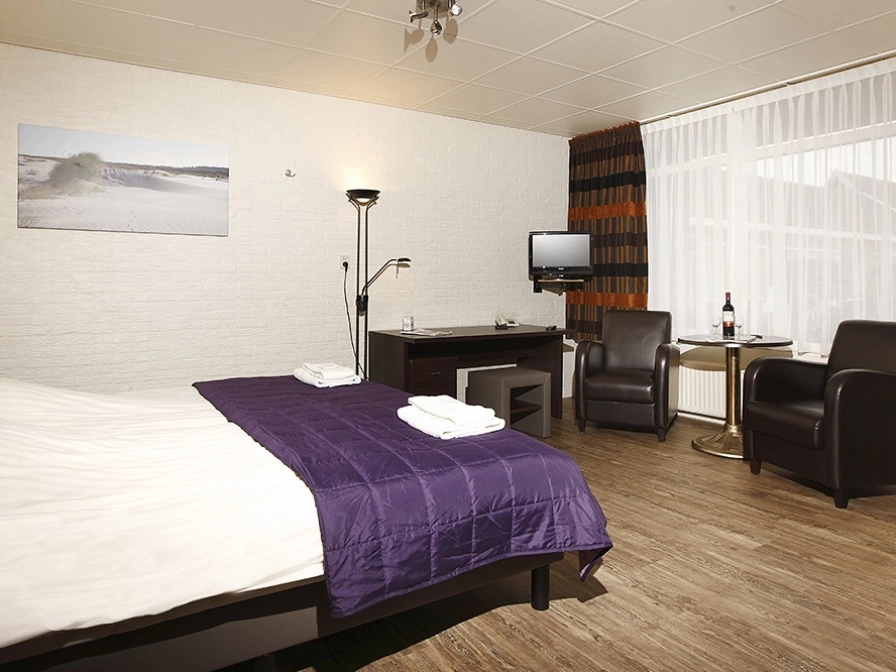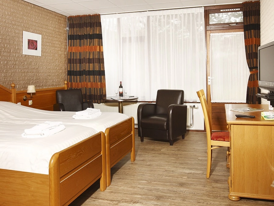 Geniet van het gemak van een kamer op de begane grond, midden in de rustige tuin van het hotel. Deze kamer is geschikt voor gasten die wat minder goed ter been zijn en is tevens rolstoelvriendelijk ingericht. U beschikt over een eigen terras waar u in alle rust kunt ontspannen. Ook uw hond is welkom, samen genieten van de natuur begint hier.