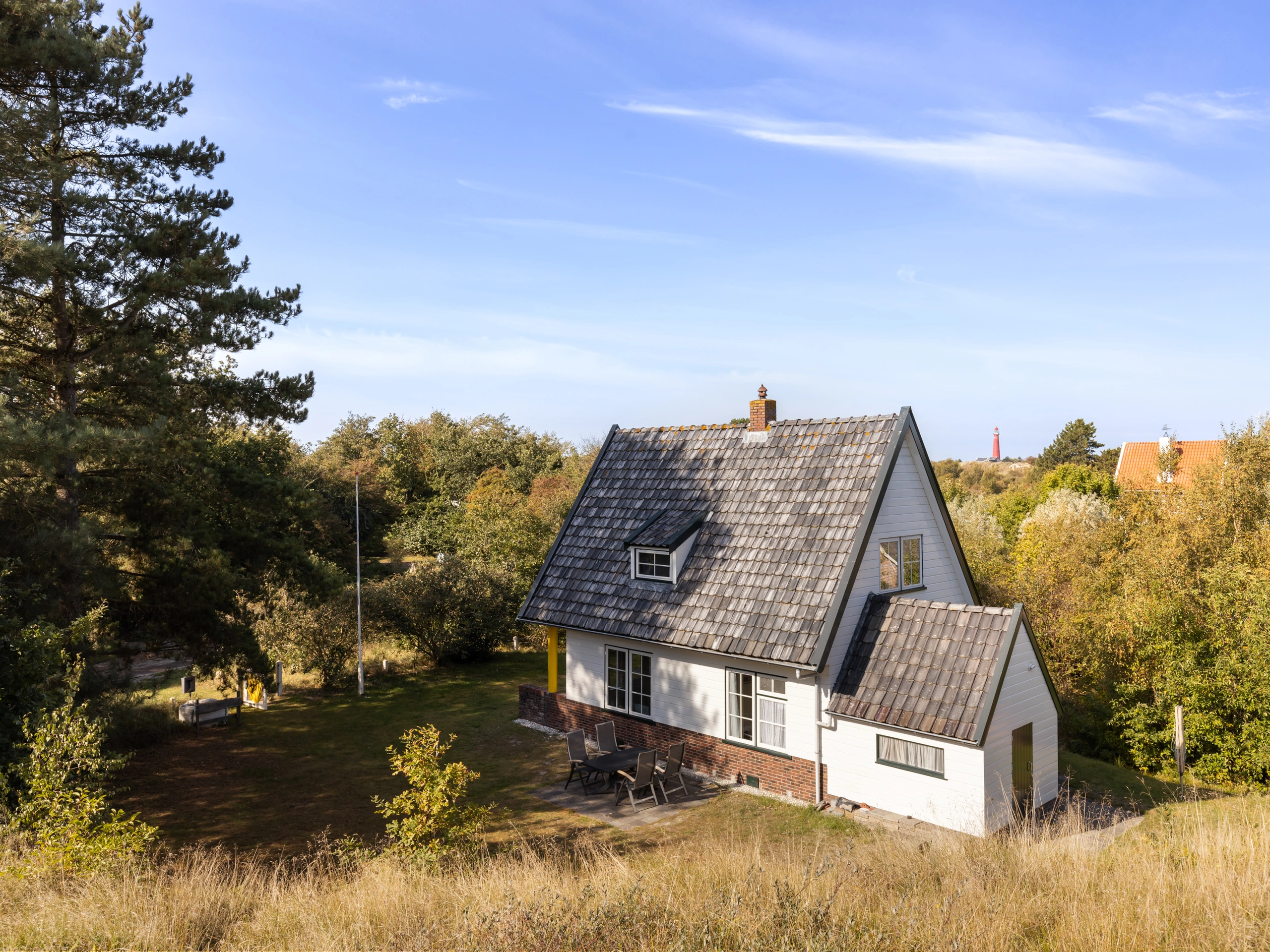 Unieke ligging tussen dorp en duinen Vakantiehuis Kijk Duin ligt op een bijzondere plek op Schiermonnikoog: officieel binnen de bebouwde kom, maar volledig omsloten door het duinlandschap. De ruime tuin van ruim 2.200 m² is feitelijk duingebied – met helmgras, zandige paadjes en natuurlijke begroeiing – waardoor je het gevoel hebt midden in de natuur te verblijven. Je wandelt zó vanuit de tuin het Vuurtorenpad op, richting strand en zee. Tegelijkertijd is het dorp op loopafstand, met winkels, horeca en voorzieningen dichtbij. Deze combinatie maakt Kijk Duin uniek: de rust en ruimte van de natuur, maar met het gemak van het dorp binnen handbereik. Een bijzonder element is de ligging aan de voet van de Zuidertoren, de voormalige vuurtoren van het eiland. Deze markante toren geeft het huis een karakteristiek decor én een fijn oriëntatiepunt op het eiland. Dankzij de vrije ligging, het weidse uitzicht en de natuurlijke omgeving is Kijk Duin een plek om op adem te komen. Binnen of buiten, op een van de zonnige terrassen of voor het raam: overal voel je de nabijheid van duin, zee en lucht.